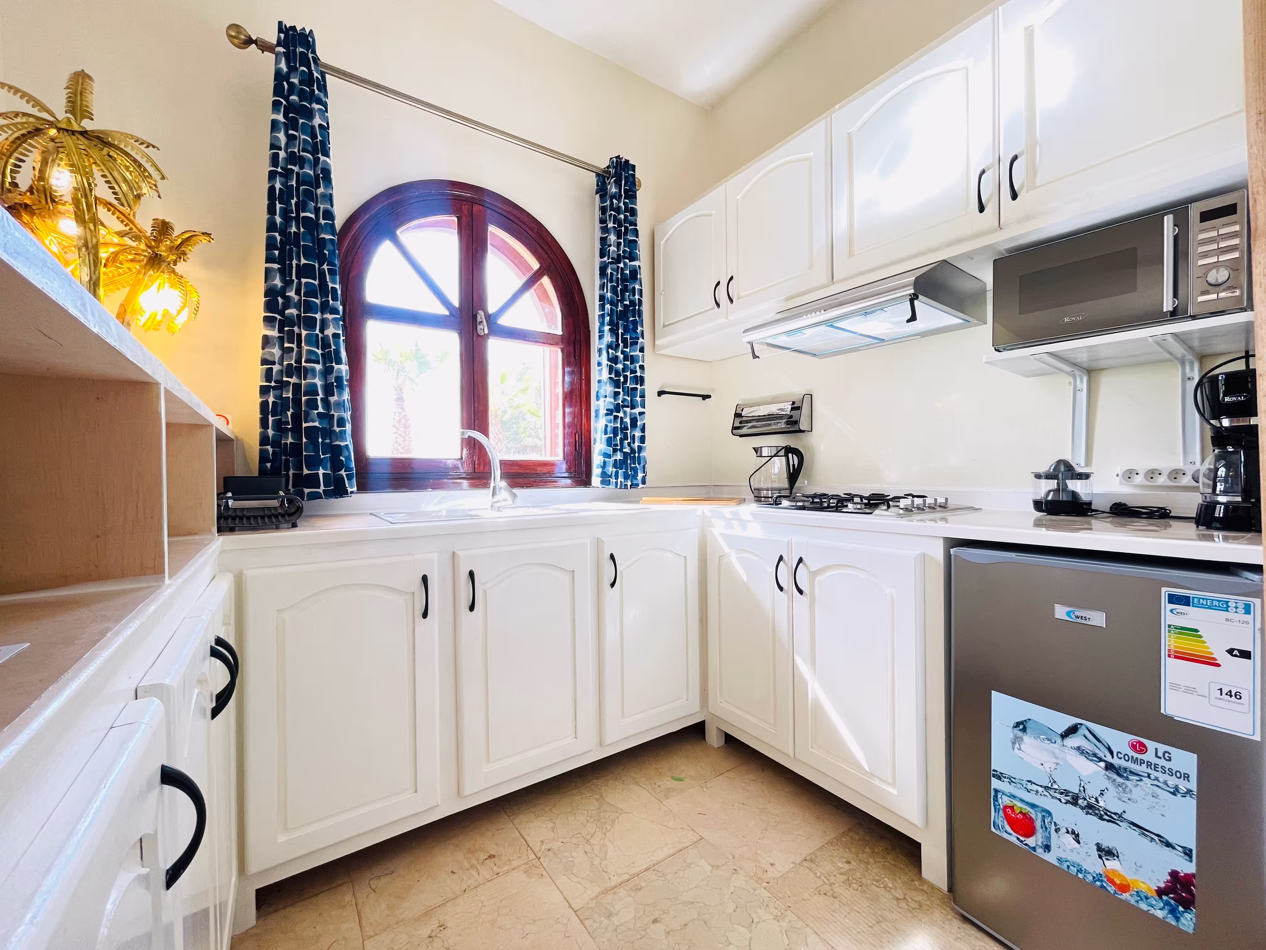 4 plaques de cuisson, réfrigérateur, micro-ondes, cafetière, bouilloire etc...